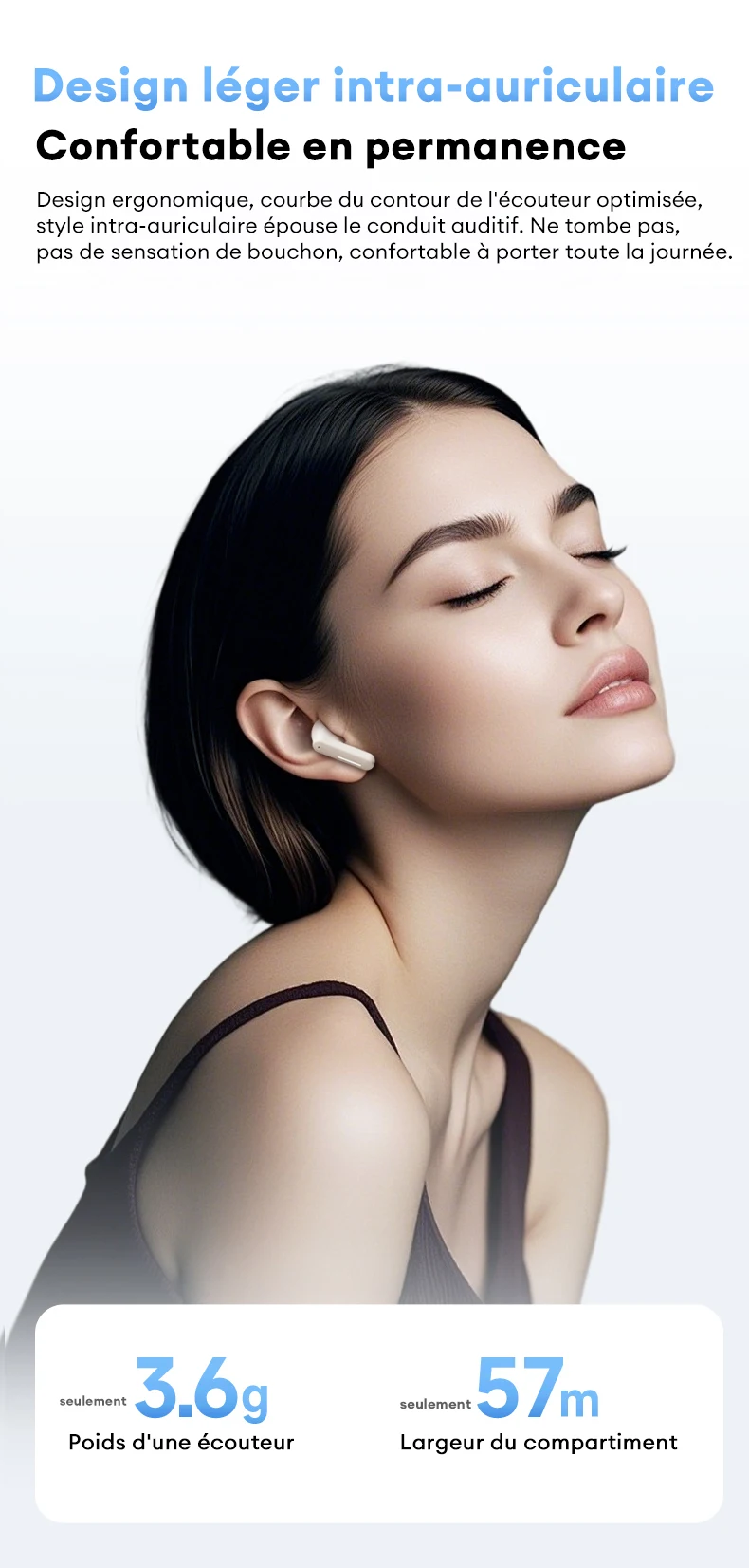 4.[Conception semi-intra-auriculaire confortable] : La courbure à double angle épouse parfaitement les contours de l'oreille. 4,6 g, ultra-légers, ils se portent sans fatigue. Restent en place pendant la sieste, restent bien en place pendant l'entraînement, sans douleur après des heures.
