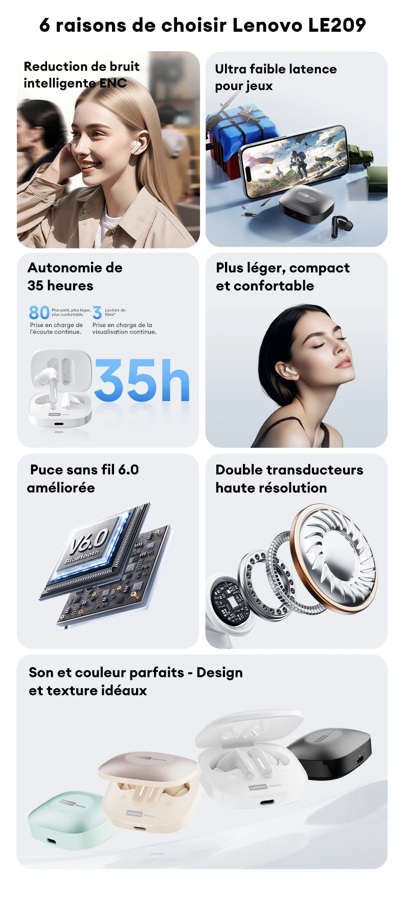 Écouteurs Bluetooth 6.0 TWS professionnels Lenovo LE209 d'origine