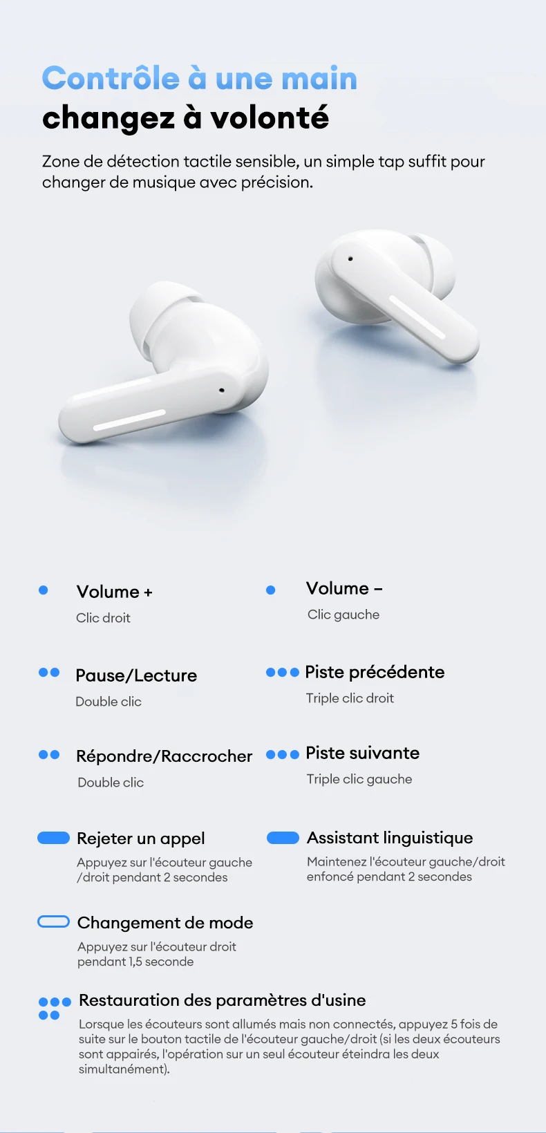 2.[Suppression du bruit des appels claire] : Réduction du bruit par double microphone ENC. La technologie intelligente de réduction du bruit identifie et filtre plus de 88 % du bruit de fond. Des algorithmes avancés filtrent le bruit de fond et capturent facilement les voix humaines pures. Communiquez en toute fluidité dans les endroits bruyants.